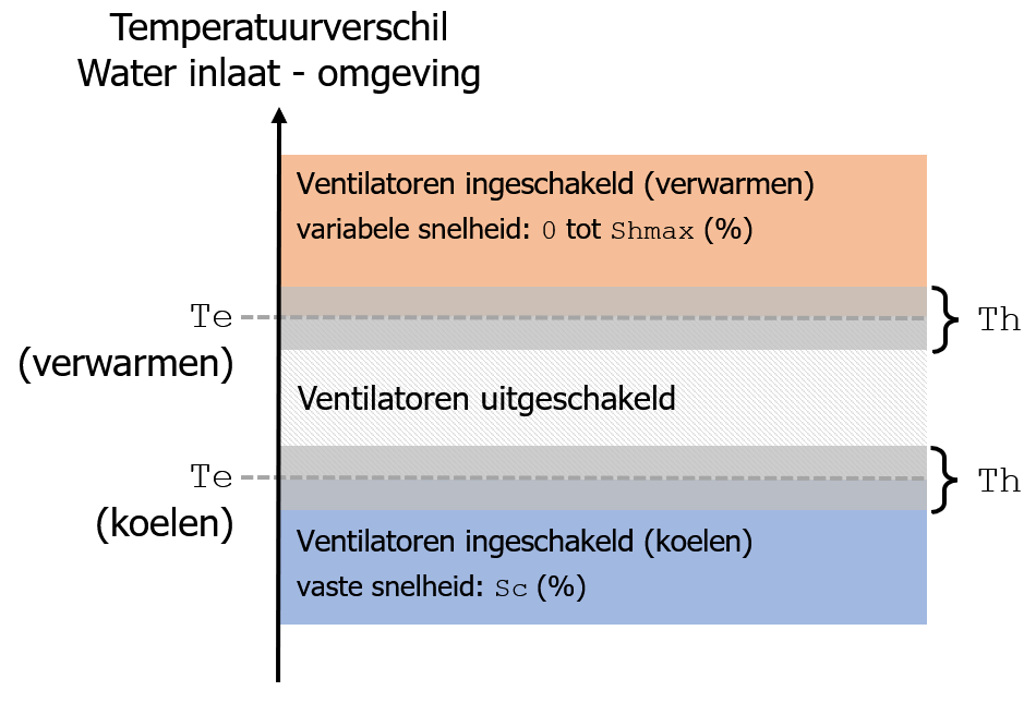 De ventilatoren worden ingeschakeld wanneer er een voldoende groot temperatuurverschil ontstaat tussen de inlaatwatertemperatuur en de omgevingstemperatuur. In de figuur hieronder is grafisch weergegeven bij welk temperatuurverschil de ventilatoren zullen worden in/uitgeschakeld op basis van parameters Te en Th.