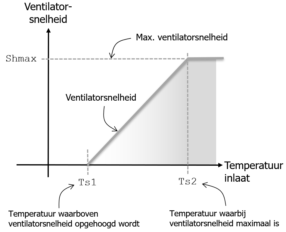 In de figuur hieronder is grafisch weergegeven wat de ventilatorsnelheid is als functie van de aanvoertemperatuur van het water. De ventilatorsnelheid wordt bepaald door de gemeten aanvoertemperatuur van het water Tinlet, de temperatuur voor 0% snelheid Ts1, de temperatuur voor de hoogste snelheid Ts2, en de maximale snelheid Shmax.